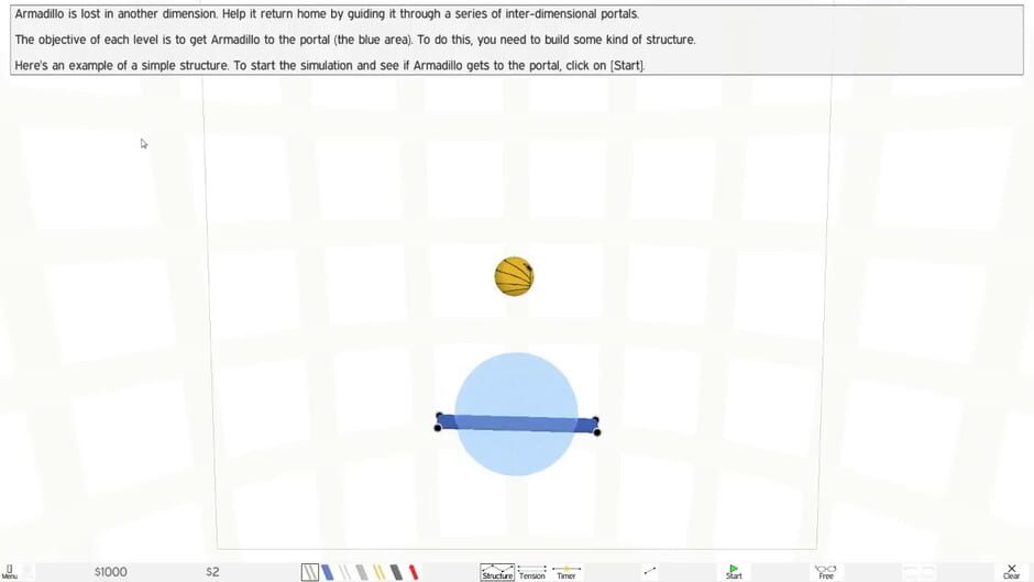 Armadillo Run is a puzzle video game created by Peter Stock and released for Microsoft Windows in 2006. The aim of the game is to get Armadillo, a yellow basketball-like object to the blue goal by creating a structure using various materials that, when activated, will get Armadillo to the goal while keeping within an inconsistently strict budget. Peter Stock cites Bridge Builder and Stair Dismount for the construction and dynamic natures of the game, respectively.